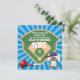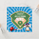 Cette mignonne invitation à l'anniversaire présente un adorable chiot chien portant un casquette de baseball et prêt à jouer au ballon. Il y a un casque de batte, chauve-souris, balle et l'arrière - plan est un terrain de baseball avec un design de starburst bleu.