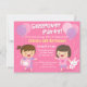 Invitation vos invités à emballer leurs pjs, coussin et sac de couchage pour une fête d'anniversaire endormi sommeil amusant! Ça va être une soirée de discussion et de plaisir pour les filles ! Le design comprend deux filles mignonnes, l'une dans une queue de poney et se tenant à un coussin tandis que l'autre avec un clip cheveux et un pantalon pois tient sur un lapin. Ils dansent joyeusement pour la fête de la mort. Symboles de musique, ballons roses et violets dans l'arrière - plan avec le texte "fête du sommeil" qui n'est pas modifiable. Personnalisez facilement le reste du texte avec les détails de votre parti. Sur la page inverse est un motif d'icônes lapin.