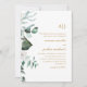 Belle faire-part de mariage rustique avec un chic blanc fleuri et verdoyant et un élégant monogramme.