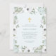 Ces jolies invitations baptistes ou baptistes présentent une élégante bordure florale peinte avec des fleurs blanches, grises et bleues douces, et des feuilles botaniques verts sur un arrière - plan bleu clair et doux avec une fausse croix d'or.