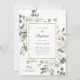 Ces belles invitations Baptême ou Christening présentent un cadre faux or entouré de jolies fleurs crème et blanches, de verdure et de feuilles eucalyptus. Il y a aussi une fausse croix d'or assortie, et le texte vert classique sur un arrière - plan blanc.