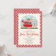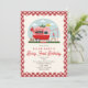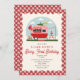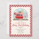 Fraise à thème "baies d'abord" avec illustration du camper de marché de fermiers décoré de en vichy bunting et de ballons rouges avec table de pique-nique et gâteau d'anniversaire de fraise. Les bordures et l'envers sont des en vichy rouges.