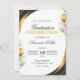 Celebrate your graduate with this elegant black and gold graduation celebration invitation. Featuring luxurious gold ribbon accents and festive balloon details, this design creates a formal and sophisticated look perfect for honoring a special achievement.