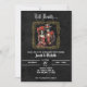 Cette invitation de fiançailles présente un design intrigant et visuellement frappant, avec un arrière - plan noir qui sert de toile dramatique pour l'illustration principale. L'invitation en elle-même est faite de papier texturé de haute qualité avec une finition veloutée, ajoutant une touche de luxe à l'aspect général. Au coeur de l'invitation, un graphisme captivant prend le devant de la scène. Le point focal est un couple de squelettes d'inspiration Dia de los Muertos magnifiquement détaillé, élégamment décoré dans les vêtements traditionnels de calavera mexicains. Le marié et le marié squelette sont représentés par un maquillage complexe de crâne à sucre, orné de couleurs vives, de motifs ornés et de délicats motifs floraux. Leurs sockets oculaires sont ornées de motifs artistiques, et leurs sourires sont chaleureux et accueillants, malgré leur apparence squelettique. Cette représentation saisissante du couple squelette est enfermée dans un cadre doré opulent qui dégage une aura d'élégance et de célébration. Le cadre est élaboré avec des motifs en filigrane complexes et des détails ornés, ce qui augmente la richesse du design. Il brille d'une teinte métallique, lui donnant une qualité royale et intemporelle.