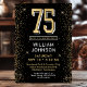 Cette fabuleuse invitation à la fête surprise de 75 ans pour hommes noirs et or, portant le numéro 75 en or avec des polices modernes et des côtés parties scintillant or, serait parfaite pour demander aux gens de se joindre à vous pour célébrer l'homme à l'âge de 75 ans de votre vie. Traditionnel et classique, il est frais, moderne et contemporain. Pour voir vos invitations uniques, sélectionnez "Personnaliser ce modèle" et entrez vos informations. C'est super facile !
