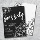 Soixante noir blanc 60e anniversaire Invitation de fête. Une invitation amusante mais élégante à la fête du 60e anniversaire avec des fleurs blanches et noires girly pour les jeunes de coeur. Un motif de fleurs ludique encadre une typographie de script "she's soixante" mélangée avec une police serif plus classique. Célébrez soixante ans de vie avec ce magnifique design botanique. La partie amusante est que vous pouvez changer TOUTES les couleurs! ! Vous pouvez non seulement modifier les couleurs et la police arrière - plans, mais vous pouvez également modifier les lignes des fleurs. Disponible sous forme d'invitation imprimée ou d'invitation numérique téléchargeable que vous pouvez envoyer par e-mail ou avoir imprimé localement !