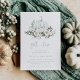 Tombez amoureux de ce design botanique éthérée pour les douches nuptiales d'automne. L'élégant design comprend un citrouille d'aquarelle blanche inscrit avec les initiales du couple et flanqué de fleurs blanches, de feuillage vert et de feuilles d'eucalyptus. "Fall in Love" apparaît en dessous, avec vos détails de douche nuptiale.