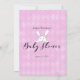 Un lapin lapin blanc au-dessus du titre de jeu avec un arrière - plan de Jacquard en diamant violet. Modèles créés pour vous. C'est un jeu de baby shower Guess The Features.