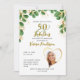 Créez des invitations uniques de 50e anniversaire blanches et dorées décorées d'une verdure émeraude verte et dorée d'eucalyptus, et personnalisées avec le nom de la dame d'anniversaire, la photo, le jour de la célébration, le lieu de l'événement, et les contacts RSVP. Vous pouvez également changer le jalon si vous fêtez les 30ème, 40ème, 60ème, etc. L'arrière est en blanc massif. Veuillez utiliser le modèle pour télécharger votre photo pour obtenir la même image en forme de coeur. Essayez quelques photos pour choisir celle qui convient le mieux à ce design. Habituellement, la photo carré fonctionne mieux.