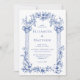 Cette faire-part de mariage d'inspiration vintage est encadrée de colonnes classiques et de motifs floraux en bleu sur un arrière - plan blanc. Les noms du couple apparaissent dans la police serif classique, avec le reste du texte en italique.