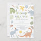 Une mignonne invitation à l'anniversaire de dinosaures avec des dinosaures dessinés à la main, des ballons et des feuilles tropicaux dans des couleurs pastel douces de vert, bleu, pêche et jaune. Un design ludique et neutre pour un 2ème anniversaire ou une soirée dino. Moderne, capricieux et facile à personnaliser.