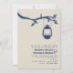 Un faire-part de mariage avec un camping/dehors un thème comportant une illustration d'une lanterne d'huile pendant d'une branche d'arbre avec le feuille. Le modèle de couleurs est bleu. Personnalisez le texte avec des détails de votre occasion.