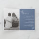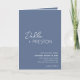 Faire-part de mariage pliée bleu poussiéreux moderne avec un design simple et minimal avec le nom de la mariée dans un script élégant et le nom du marié dans une police sans serif contemporaine. Vous trouverez ci-dessous, dans le coin inférieur droit, les détails de votre événement dans un agencement minimaliste. L'intérieur a votre photo préférée et vos détails supplémentaires, y compris un code QR optionnel (si vous préférez, le code QR peut être supprimé dans l'outil d'édition de conception). Le verso comporte deux sections facultatives supplémentaires pour plus d'informations.