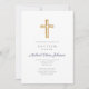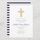 Invitation Bleu marine Script Croix religieuse garçon Baptême
