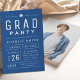 Une typographie moderne et minimaliste amusante invitation à la fête de graduation en marine, bleu et blanc, Personnalisez-le avec votre propre texte et informations de fête.
