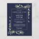 Une carte postale d'invitation élégante et personnalisée à l'aquarelle botanique pour la célébration de la vie en souvenir, avec un feuillage de verdure à l'aquarelle botanique sur fond bleu nuit. Conçue par Thisisnotme©