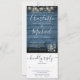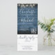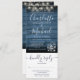 Un faire-part de mariage tout en un avec de jolies lampes à cordes et des jarres en maçon, des noms de script signature moderne et une typographie élégante sur un arrière - plan en bois rustique bleu. L'invitation comprend une carte RSVP qui peut être coupée et des informations sur les invités. Conçu par Thisisnotme©