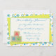 Invitation Baby shower pour une fille ou un garçon avec la cigogne des blocs de jouets ABC et bordure de cercles bleus et jaunes. Les invitations sont faciles à customiser et sont accompagnées d'enveloppes et de votre choix de papier.