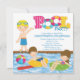 Mettez sur pied votre réception au bord de la piscine outre de la droite avec notre invitation mignonne superbe de fête d'anniversaire de garçon de réception au bord de la piscine de bain nos caractéristiques uniques d'invitation de partie de plage de piscine d'été un garçon blond mignon utiliser un maillot de bain se tenant sur le bord d'une piscine avec une natation de fille et de garçon dans la piscine. Soutenez des coordonnées d'invitation avec l'avant et avez des nouilles de bain et un ballon de plage. En outre disponible dans un garçon de brune et pour des filles dans notre magasin. Invitation parfaite de réception au bord de la piscine pour un ado et une partie de natation de tween. Personnalisez juste avec votre information et vous êtes tous placez pour aller ! Articles assortis comprenant des timbres-poste d'anniversaire, autocollants de faveur, merci vous carde et remercie que les autocollants sont également disponibles dans notre magasin. illustrations de ©JW de www.celebrateitinvites.com
