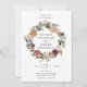 Des invitations à des mariages floraux élégantes pour des mariages d'automne ou d'hiver sont nichées à l'intérieur d'une couronne de roses d'aquarelle, de mamans et de verdure aux couleurs d'automne rustiques, dont la pêche, l'ivoire, le rougissement, le bordeaux et le vert. Personnalisez avec vos détails mariages en noir doux et élégant. Les cartes s'inversent à un motif floral d'automne correspondant.