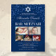 Invitations de bar mitzvah personnalisées avec un arrière - plan bleu élégant, parties scintillant, étoile de david symbole, 5 photos de votre enfant, et un modèle de fête mitzvah pour vous de customiser.