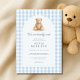 Baby shower invitation designed with a classic blue gingham pattern and a We Can Bearly Wait teddy bear theme. The layout keeps the design soft, playful, and easy to read, making it suitable for a warm and welcoming baby shower celebration. Ideal for boy baby showers, neutral bear themes, and cozy daytime gatherings. Fully customizable text with a clean, print-ready layout.