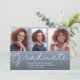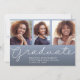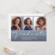Invitation de la fête de graduation avec une police de script élégante et vos 3 photos sur un arrière - plan bleu. Le dos est blanc avec du texte noir, mais entièrement personnalisable avec l'outil de design de Zazzle.