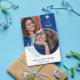 Invitation de graduation recto verso en blanc et bleu avec des photos superposées et de la verdure avec des polices propres. Invitation de remise de diplômes avec un design moderne personnalisé avec des photos du diplômé, deux d'un côté et l'autre, et le nom du diplômé, l'année, et l'école. Une invitation à la graduation de verdure bleue avec des photos et une disposition unique en bleu, blanc et turquoise.