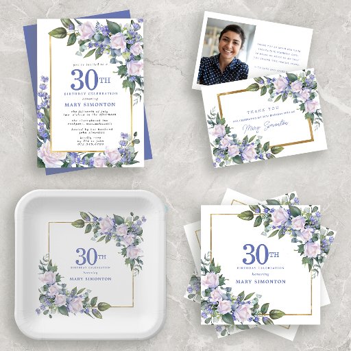 30th Birthday White Blue Gold FloralConçu par Nelda Hoxie
