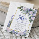 Faites honneur à une femme spéciale avec cette invitation élégante et féminine 90e anniversaire. 90ème est écrit en gros texte bleu. La célébration d'anniversaire suit. Le nom de l'invité honoré est également en lettres majuscules bleues. Le reste du texte est doucement gris colombe. Les détails de la fête d'anniversaire sont entourés d'un cadre doré chic, décoré de roses blanches et de fleurs bleues. Les éléments floraux sont nichés dans des feuilles verts. Bien qu'il s'agisse d'un design traditionnel, le feuillage botanique ouvert et aéré et le texte lui donnent une ambiance contemporaine. L'invitation en retour est à peine là bleu profond.