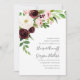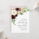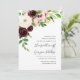 Élégante et moderne, la faire-part de mariage florale présente une cascade de roses et de pivoines d'aquarelle en ivoire, rose vif et marsala bordeaux, avec des plantes vertes luxuriantes et du feuillage. Les détails de votre mariage sont alignés à droite dans un élégant lettrage noir foncé accentué par un script écrit à la main.