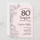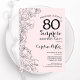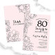 Surprise florale rose et blanche à 80e anniversaire invitation à la fête. Design moderne élégant avec accents botaniques et police de script typographique. Carte invitation florale simple parfaite pour une célébration anniversaire surprise femme élégante. Peut être customisé à n'importe quel âge. Invitations Zazzle imprimées ou téléchargement instantané modèle imprimable numérique.