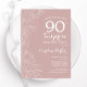 Surprise florale rose et blanc à 90e anniversaire invitation à la fête. Design moderne élégant avec accents botaniques et police de script typographique. Carte invitation florale simple parfaite pour une célébration anniversaire surprise femme élégante. Peut être customisé à n'importe quel âge. Invitations Zazzle imprimées ou téléchargement instantané modèle imprimable numérique.