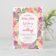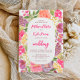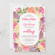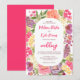 Faire-part de mariage chic en arche fleurie et bohème, joli peint à la main, fleurs sauvages vives et audacieuses, mêlent une atmosphère vintage, avec des pivoines de corail, des fleurs violettes, des roses roses et de la verdure, avec une fête de mariage botanique sur le thème du boho. Avec une typographie de script moderne et rose néon.