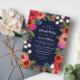 Faire-part de mariage florale avec des fleurs dessinées à la main dans de magnifiques combinaisons de couleurs - vert olive avec orange et rose chaud et corail et bleu marine - formant un cadre autour de votre texte d'invitation en polices blanches. Le dos est imprimé à la texture de bouleau.