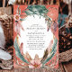 Cette faire-part de mariage bohème présente une délicate couronne de plumes, de feuilles et de fleurs autour d'une zone de texte centrale, avec un attrapeur de rêve ajoutant une touche de fantaisie. Contre un arrière - plan corallien mou, les tons terreux et les éléments naturels créent une atmosphère sereine et libre, parfaite pour un mariage d'inspiration boho. Ce design saisit l'essence d'une fête décontractée et amoureuse de la nature, idéale pour les couples à la recherche d'un style mariage unique et décontracté.