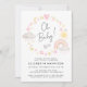 Invitation Whimsical boho bébé fille douche avec des aquarelles roses et jaunes d'un arc-en-ciel, soleil, coeurs, étoiles, lunes et nuages, "Oh Baby!" dans un script élégant et le nom de la future mère et les détails de la douche dans la typographie simple.