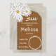 Une élégante carte d'invitation à l'anniversaire avec trois grandes marguerites blanches, une forme d'arche caramel-brun et argent exposée sur un motif en verre blanc argenté. Dans le coin inférieur droit, une photo personnalisée mentionne l'âge de la personne qui a l'anniversaire.