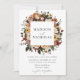 Élégantes invitations de mariage d'automne avec vos noms à l'intérieur d'un cadre carré entouré de fleurs d'aquarelle et de verdure dans des couleurs automnales muettes d'ivoire, d'orange, d'or moutarde, de vert olive, de rose poussiéreux et de marron. Les invitations de mariage florales d'automne s'inversent pour montrer un riche arrière - plan d'aquarelle vert olive. Conçu pour coordonner avec notre collection Boho Autumn Floral mariage.