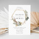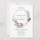Elégante et unique faire-part de mariage florale avec vos noms à l'intérieur d'un faux cadre géométrique de feuille d'or orné de fleurs d'aquarelle blanche et feuillage luxuriant dans des tons riches de terre verte, beige et marron. Personnalisez les invitations florales en ajoutant des détails tels que la date, l'heure, le lieu et l'information de réception du mariage. L'invitation revient à un arrière - plan d'aquarelle beige clair.