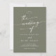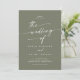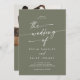 Cette photo boho chic vert olive et son faire-part de mariage de code QR sont parfaits pour un mariage minimaliste. La tonalité bohème vert foncé bohème moderne est composée d'une calligraphie rustique simple au style unique mais classique. Personnalisez le dos de votre invitation de mariage avec votre photo fiançailles préférée. Inclure un code QR pour que l'invité puisse facilement RSVP, afficher les détails ou les deux.