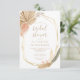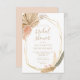 Cette invitation branchée à la douche nuptiale boho présente un cadre géométrique doré décoré de feuilles de palmiers tropicaux séchés à l'aquarelle et d'herbe pampas dans les tons beige, pêche et vert muet. Customisez le texte beige avec vos détails de douche nuptiale. L'envers est un camaïeu coordonné de beige foncé teinté pêche.
