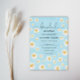 Le design des marguerites sur un arrière - plan bleu est un thème exquis et charmant pour une invitation à la fête de la douche nuptiale. Les teintes vibrantes et vives des marguerites, délicatement peintes avec des aquarelles, créent un sentiment d'élégance et de grâce naturelles. Les détails complexes de la conception sont visuellement captivants, chaque marguerite et feuille soigneusement placés pour créer un motif harmonieux et sans soudure. L'arrière - plan bleu apporte une touche de sérénité et de tranquillité à l'ensemble, créant un équilibre parfait entre animation et calme. Le design est une merveilleuse représentation de la personnalité de la mariée, mettant en valeur son esprit libre et fantaisiste. C'est une invitation qui respire la joie, la chaleur et la fête, et qui laissera une impression durable à tous ceux qui la reçoivent. Des articles adaptés sont disponibles. С écoute !