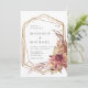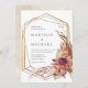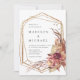 Faire-part de mariage floral élégant et unique avec ses détails mariages encadrés par un cadre géométrique de feuille d'or imitation avec un bouquet de fleurs d'aquarelle bordeaux, violet, rousse et corail avec un riche feuillage de tons beige et marron. L'invitation revient à un arrière - plan d'aquarelle beige clair.