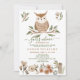 Créez la parfaite boho bois animaux bébé faire-part + baby shower invitation avec cette moderne "Guess Whoooo est presque due" les citer en typographie script et aquarelle artwork. L'arrière de la carte présente un renard peint à la main, un écureuil et un hérisson dans une illustration sur le thème des animaux des bois. Copyright Invitations élégants, tous droits réservés.