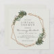Invitations de douche virtuelle boho moderne avec vos détails de l'événement à l'intérieur d'un cadre géométrique doré entouré de verdure et de fleurs blanches. Ce design botanique est parfait pour une douche nuptiale par la poste pour quand vous ne pouvez pas vous réunir en personne. Cadre avec l'aimable autorisation de :<a href="http://www.freepik.com">Conçu par Freepik</a>