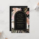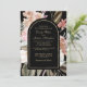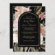 Elégante faire-part de mariage de style boho avec de jolis roses d'aquarelle rose vif et une variété d'autres fleurs et verdure sur un arrière - plan noir.