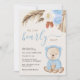 Invitation Boho bébé garçon douche avec une aquarelle illustration d'un ours en peluche mignon, un bouquet de beige et de terre cuite pampas herbe et flores bleues et "We Can Bearly Wait" dans un mélange de typographie simple et un script d'accompagnement élégant.