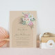 Cette belle invitation au baby shower présente une forme d'arc en beige avec de l'herbe de pampas boho et des fleurs rose, vert et blanc.