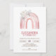 Une invitation à l'anniversaire de l'arc-en-ciel boho, ornée de roses blanches, pour célébrer le jalon de votre petit !